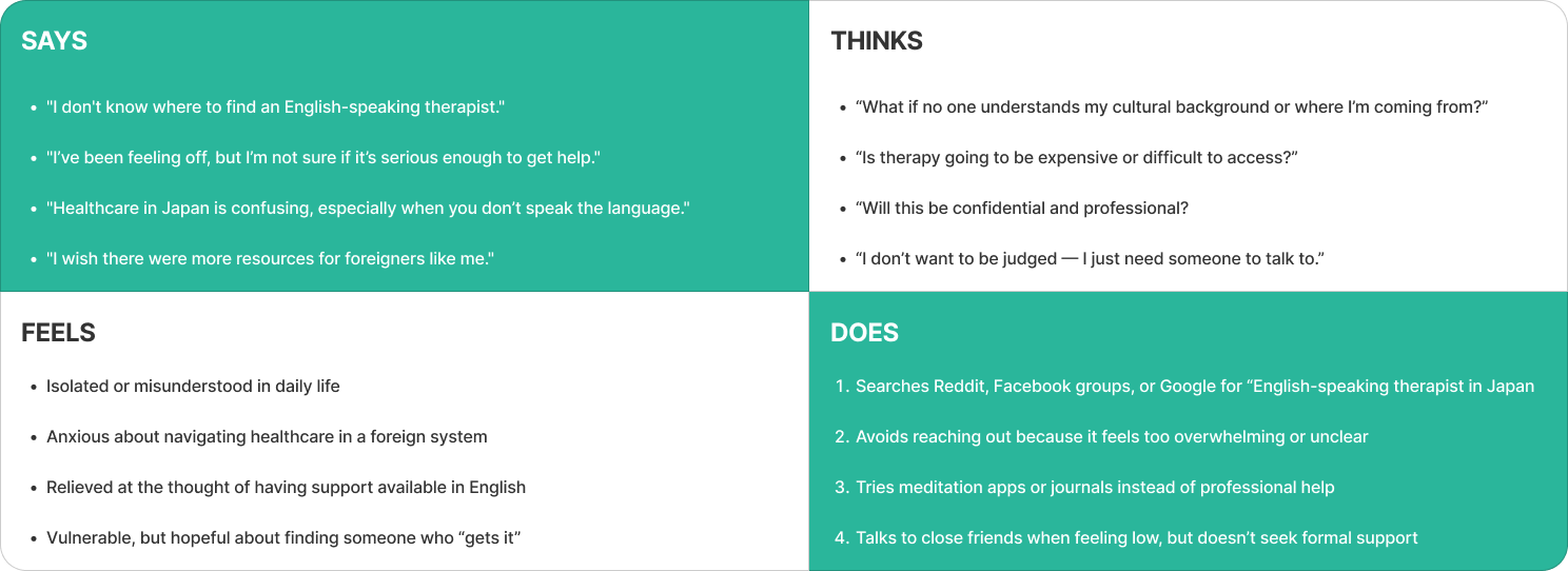 There was a clear and strong desire for a platform that provides English-language support, simplifies access to therapy and medication, and creates an emotionally safe, easy-to-navigate experience.